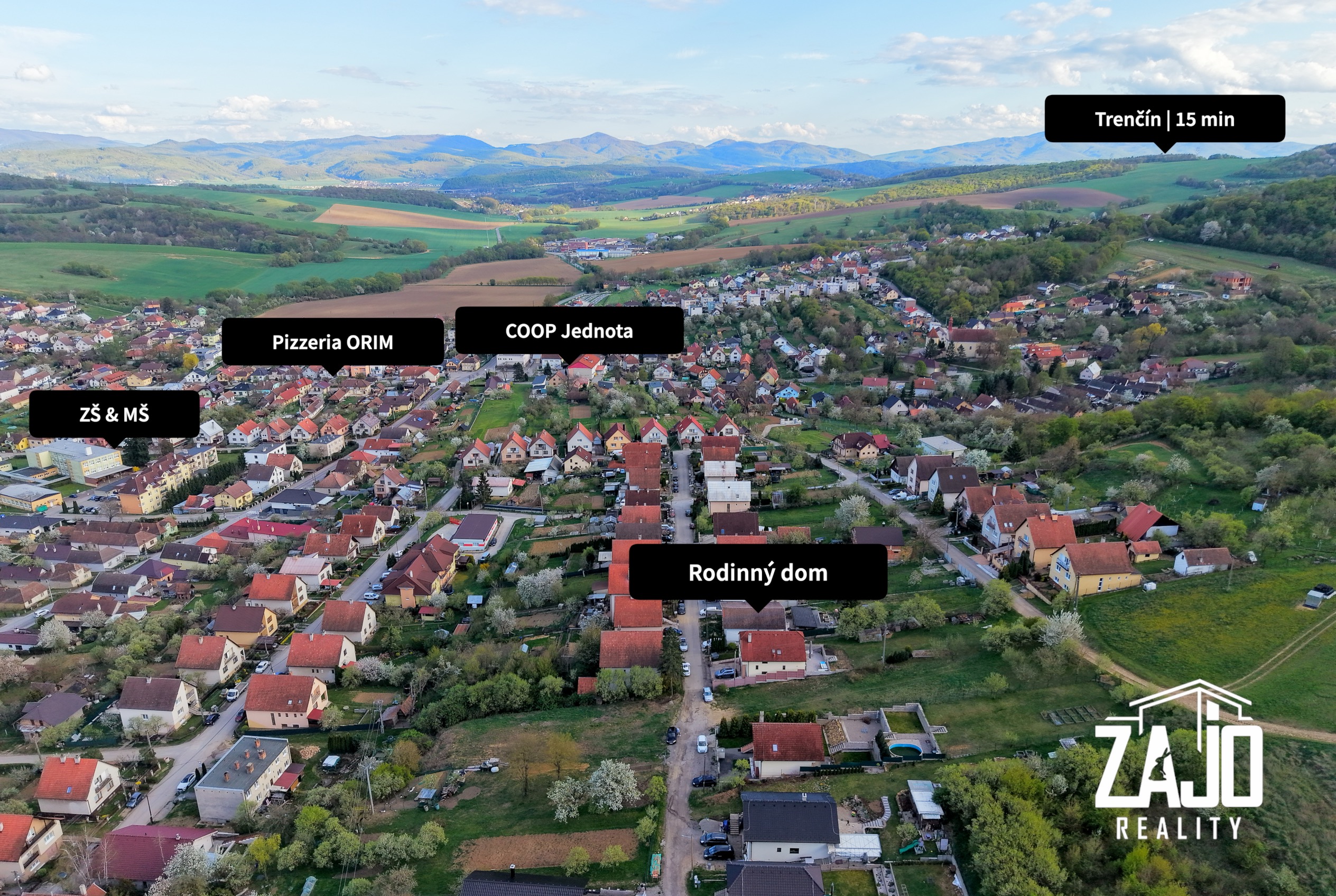 - Dostupnosť: Výborné a rýchle spojenie do krajského mesta Trenčín (cca 10–12 minút autom), pričom v obci pravidelne premáva prímestská doprava.